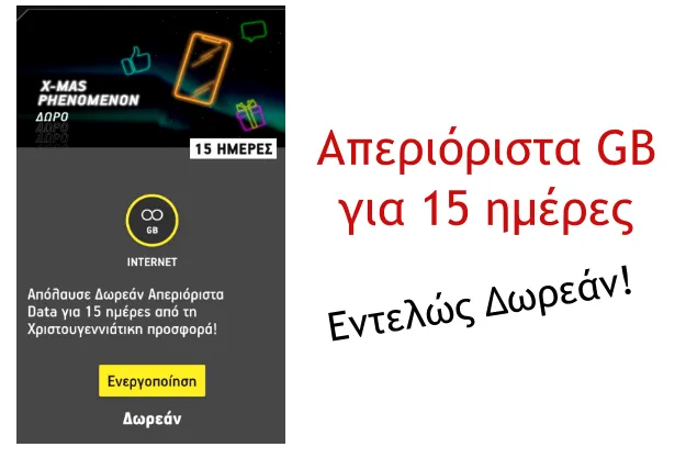 Σούπερ Χριστουγεννιάτικη προσφορά από την Cosmote και το What's Up, όπου μπορείς να απολαύσεις εντελώς δωρεάν Απεριόριστα Δεδομένα για 15 ημέρες! Η προσφορά μπορεί να ενεργοποιηθεί μόνο μια φορά έως και 2/1/2024. Οπότε, αν θέλεις να βγάλεις όλες τις γιορτές με δωρεάν σερφάρισμα, περιμένεις λίγες ημέρες ακόμα και το ενεργοποιείς την περίοδο των εορτών!